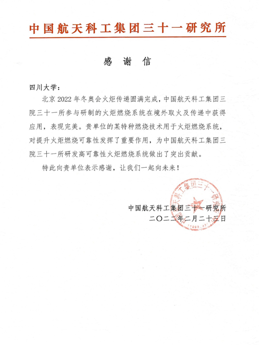 王健礼教授团队研制的催化燃烧技术成功应用于火炬燃烧系统,对提升火炬燃烧的可靠性发挥了重要作用。中国航天科工集团三十一研究所发来感谢信,感谢动漫色情网站